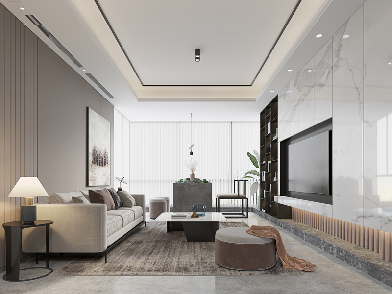 本案以现代简约风格为内核,黑白灰与米棕为中性主调,借利落线条、金属与石材等质感材质构建层次。诠释“干练与舒适共生”的居家美学,为居者打造兼具格调与烟火气的现代生活场域。
