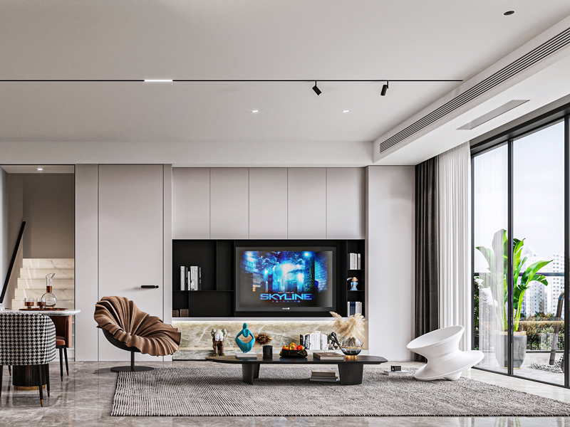 大面积落地窗让整体采光充足空间明朗,电视背景墙采用整面墙柜子的组合形式呈现,使得空间功能性更加丰富。