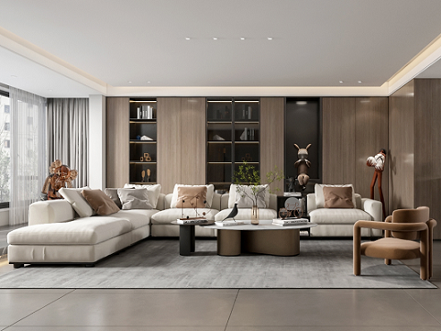 以米白、深灰的低饱和色调定克制基调,浅棕与木饰面注入温暖质感,皮质、石材的点缀强化精致度。冷暖材质碰撞出层次,却无冗余装饰,让空间在简约形制里,既显整洁秩序,又藏生活温度,避免寡淡感。