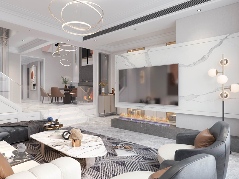 以米白、深灰的低饱和色调定克制基调,浅棕与木饰面注入温暖质感,皮质、石材的点缀强化精致度。冷暖材质碰撞出层次,却无冗余装饰,让空间在简约形制里,既显整洁秩序,又藏生活温度,避免寡淡感。