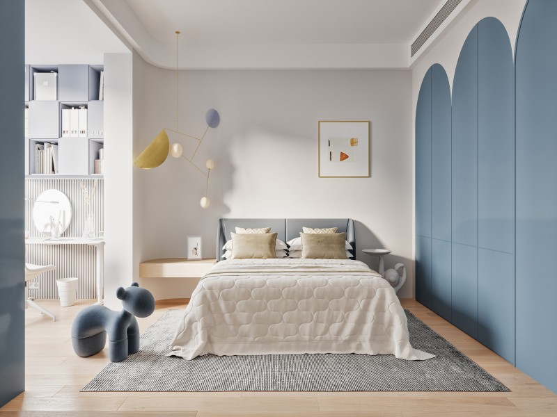 儿童房的配色宜淡不宜重,不宜采取多种配色。最多不超3种以上色彩搭配,过多的颜色会给孩子带来视觉疲劳,儿童房应以敞亮、轻松为主题的色彩搭配,例如选用蓝白色儿童房,白色为主,蓝色为辅做点缀,增加房间的层次感和活力,给孩子一种清新的轻快感。