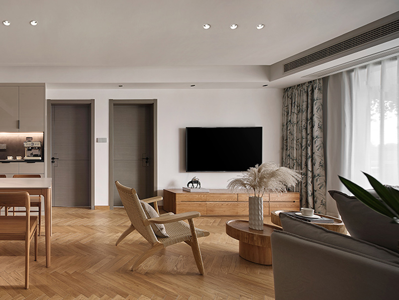 整体设计十分简洁,木质地板采用人字拼的设计让空间更饱满气质,赋予空间质朴,呈现惬意的生活空间。