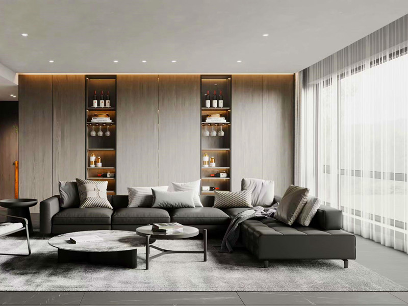 将沙发背景墙设计成满墙式收纳柜,采用开放格和隐藏格相结合的设计形式,既能丰富客厅的储物能力,又能用来摆放红酒、摆件等增加空间颜值。