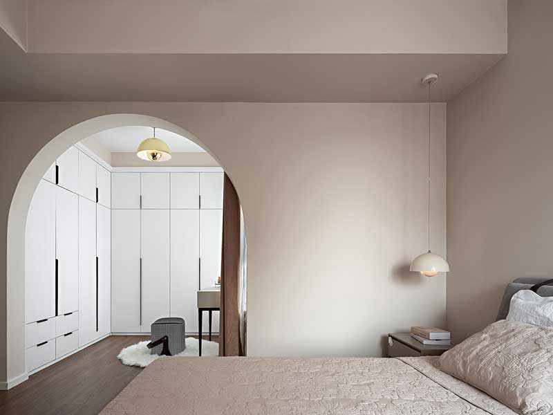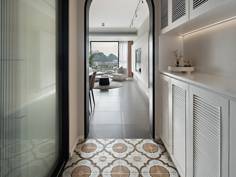 玄关区域分区清晰明确,通过地砖与拱门将归家仪式感拉满,玄关柜设计十分实用满足区域收纳需求。