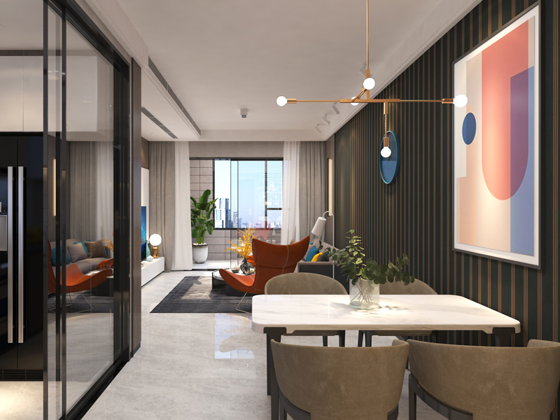 餐厅区域布局在厨房的外部,生活动线便捷合理,合理利用了有限的空间,增加装饰挂画避免单调。