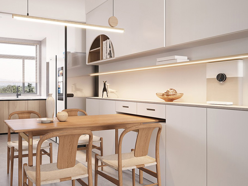 根据实际结构定制餐边柜,收纳功能可以得到充分挖掘,根据使用频率同时定制多样化的收纳区域,更合理,减少空间占用。