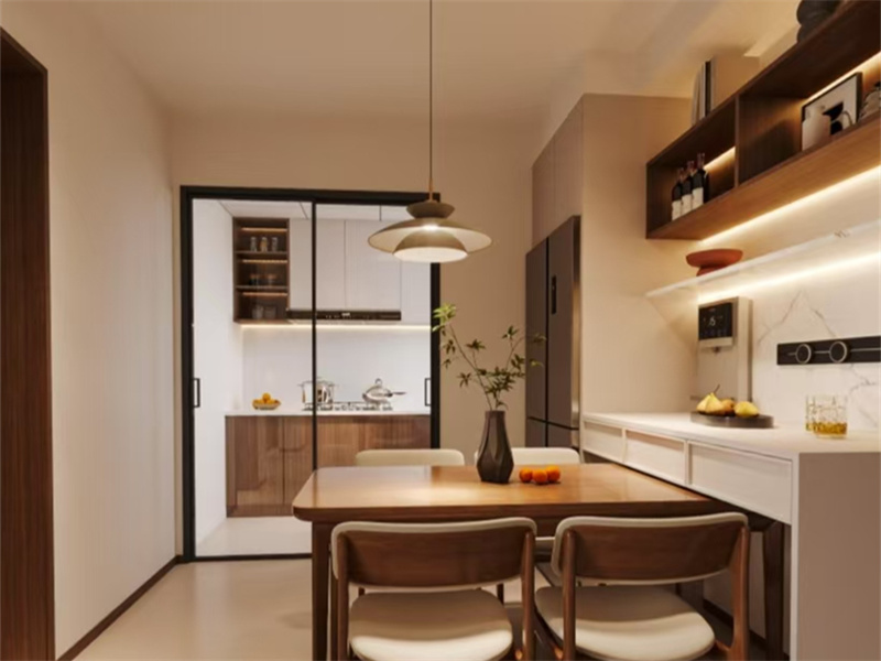 以木色与暖白为主调,营造出温馨雅致的用餐氛围。木质餐桌搭配简约餐椅,实用且具质感,独特造型的吊灯为空间注入设计感。开放格与封闭柜结合的收纳设计,满足物品存放与展示需求。