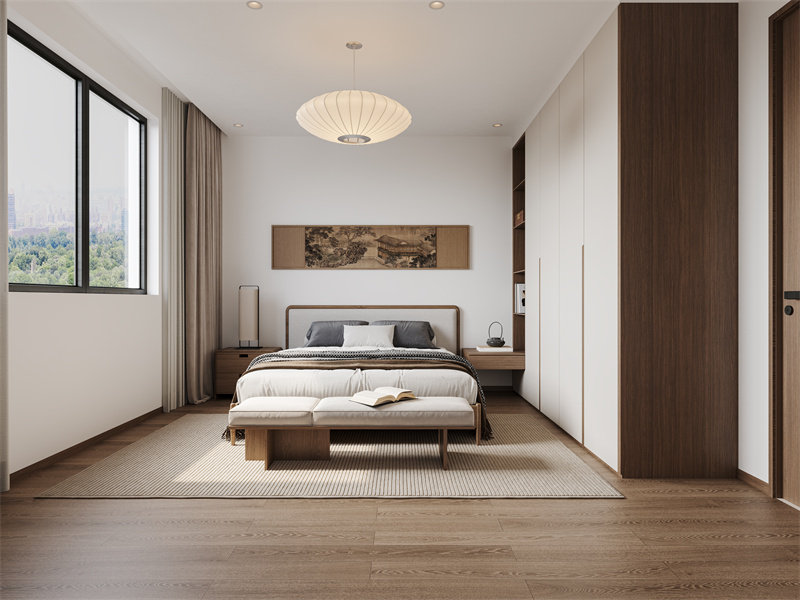 装饰画与灯具,为空间注入文化气息,充足的柜体满足收纳需求,大窗户引入充足自然光线,床品搭配和谐,打造出放松且具中式韵味的睡眠环境。