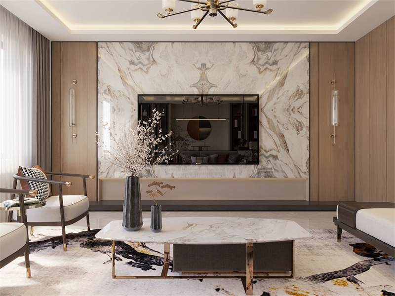 米白、深棕与金属色交织,对称布局搭配中式摆件。日常社交休闲时,雅致色彩传递文化质感,大理石与木艺材质融合现代轻奢与中式韵味,适配家庭聚会、品茗闲谈,于精致布局中尽显文化底蕴的互动场域。
